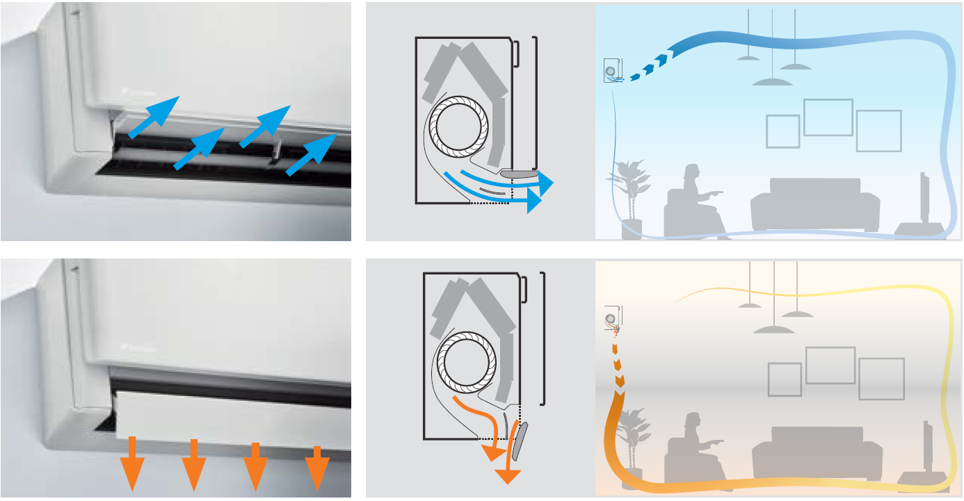Při chlazení je chladný vzduch veden vzhůru ke stropu. Tam se rozprostře po celé ploše místnosti a pozvolna klesá dolů. Díky tomu nedochází k nepříjemnému pocitu studeného proudu přímo na tělo.