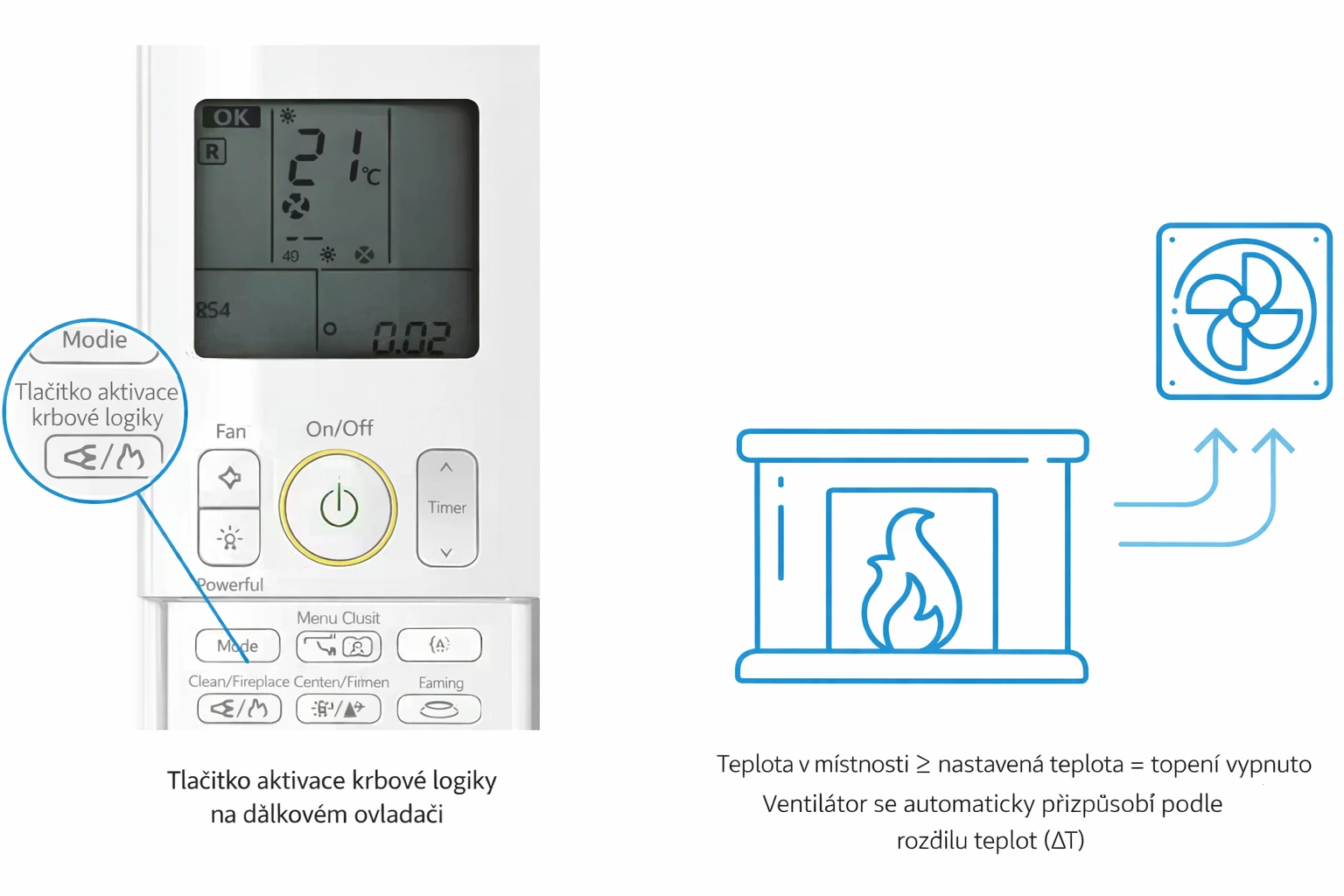 - ventilátor pokračuje v chodu, aby rozvedl teplý vzduch po místnosti.