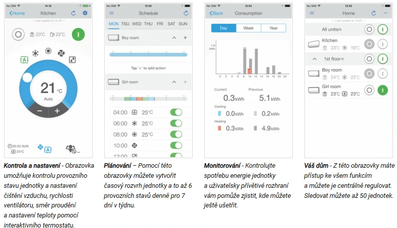 Pomocí mobilní aplikace můžete klimatizaci ovládat odkudkoli – nastavovat teplotu, režimy, časovače nebo sledovat spotřebu energie. Ovládání je intuitivní a přehledné, vhodné i pro méně technicky zdatné uživatele.